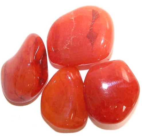 Carnelian is a semi-precious, iron-rich stone consisting of a dull red or reddish-white variety of Quartz / Chalcedony.