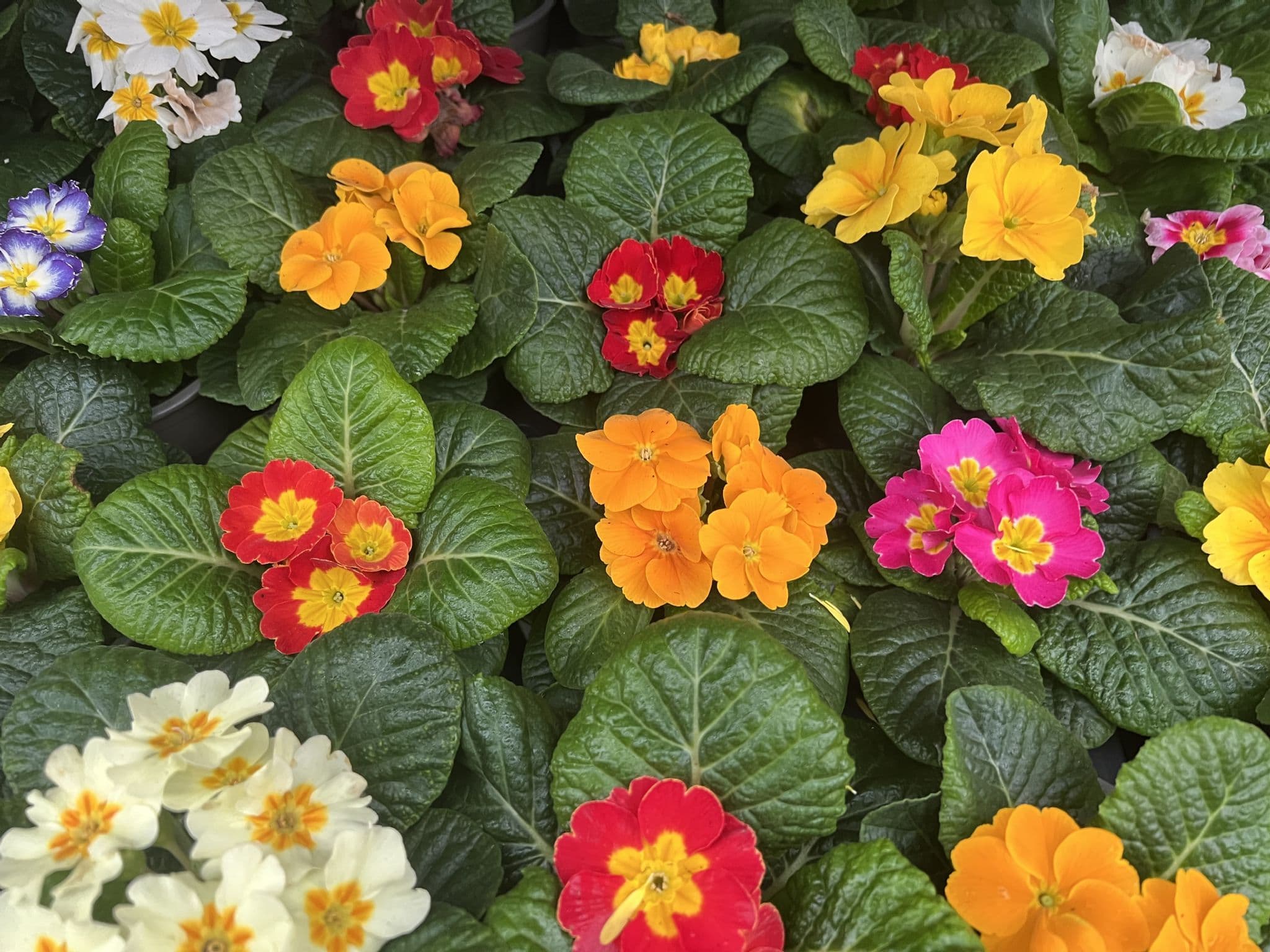 Primrose flowers (Primula polyantha) bloom in early spring, offering a variety of form, size, and colour.