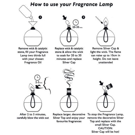 - To stop the Fragrance Lamp, remove the decorative silver top and replace with the small Silver Cap. Caution: the silver cap will be hot.