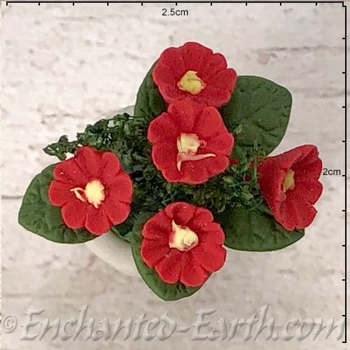 Five pretty red flowers with lemon centre's and dark green leaves all growing in a miniature white pot made by hand from terracotta.