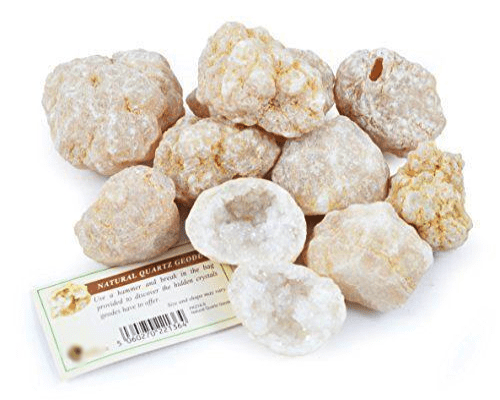 With just a hammer and the pouch provided, you can break open these white quartz geodes to discover the beautiful crystals hidden within.