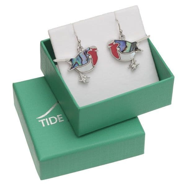 Tide Jewellery inlaid Paua and Mother of Pearl shell and red epoxy robin hook earrings.